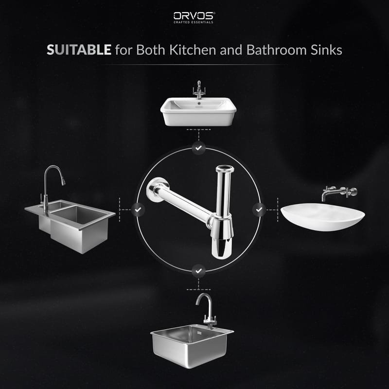 Orvos Premium Brass Bottle Trap with Stainless Steel Pipes Complete your sink installation with the Orvos Premium Bottle Trap, a perfect blend of modern design and unmatched durability. This high-quality bottle trap is a functional and stylish solution that keeps your plumbing hidden while providing a clean, elegant look. Superior Quality, Built to Last Unlike standard plastic traps, the Orvos bottle trap features a solid brass body for exceptional strength and longevity. Paired with a set of rust-free stainless steel pipes, this unit is designed to withstand moisture and corrosion, ensuring a long-lasting, leak-proof performance. The brilliant chrome finish not only adds a touch of sophistication to your kitchen sink or wash basin but also resists tarnishing, keeping your plumbing looking new for years. Designed for Performance and Style The modern cylindrical design of this bottle trap offers a sleek alternative to traditional P-traps, giving your plumbing a streamlined, minimalist appearance. It is an ideal fit for both kitchen sinks and wash basins, effectively trapping debris and preventing clogs and odors. Choose Orvos for a reliable, rust-free, and stylish solution that combines the best in materials and design.